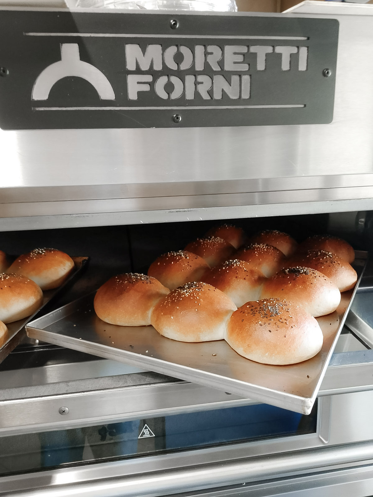 pomodoro, fior di latte, prosciutto cotto, olive, champignon, carciofi, olio Evo — €9